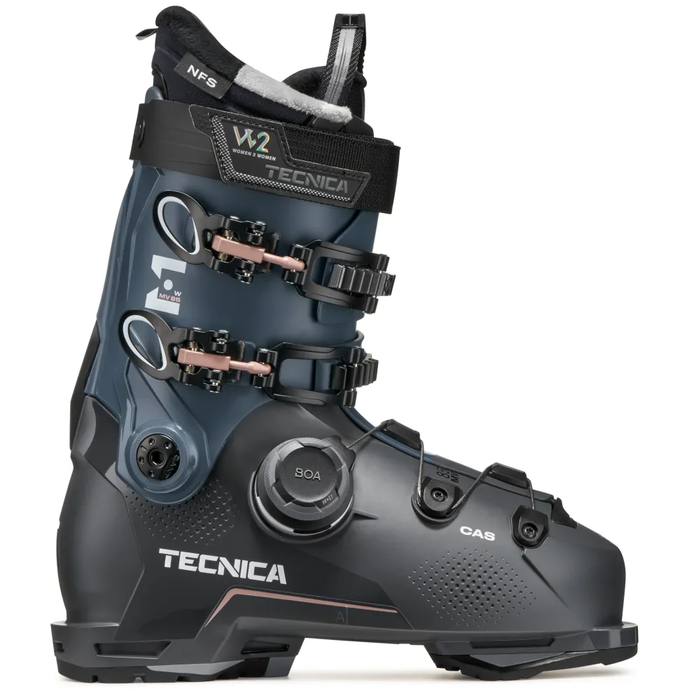 De Tecnica Mach BOA MV 85 W GW skischoenen voor dames zijn zeer comfortabel. Deze skischoenen van Tecnica zijn voorzien van een bredere, anatomisch gevormde shell met verstelbare buckles en BOA-sluiting. De N.F.S. voering is zeer zacht en vormt zich ook naar de vorm van uw voeten. Het zachtere plastic maakt de instap nog eenvoudiger. Verder zijn deze skischoenen voorzien van GripWalk buitenzolen.